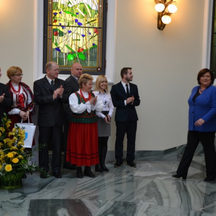 Na powitanie panie z KGW wraz gospodarzami Gmin: Nowej Słupi, Waśniowa i Górna wręczyli Annie Komorowskiej bukiet kwiatów. Przewodnicząca "Chełmowianek" Wioletta Krzyżanowska podarowała Pani Prezydentowej obraz Świętego Krzyża. Wójt gminy Nowa Słupia Wiesław Gałka przekazał Annie Komorowskiej trzy najnowsze pozycje wydawnicze: „Bazylika Mniejsza na Świętym Krzyżu”, „Święta Góra Krzyżem Naznaczona” i najnowsza edycję „Kazań Świętokrzyskich” w wersji multimedialnej. Prosił o przekazanie ich prezydentowi Bronisławowi Komorowskiemu. Wójt Wiesław Gałka zaprosił jednocześnie Parę Prezydencką na uroczystości oddania do użytku odbudowywanej wieży kościelnej w Sanktuarium Świętokrzyskim, którą zniszczyli Austriacy podczas pierwszej wojny światowej.