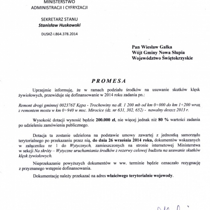 Drugą promesę w wysokości 200.000,00 zł gmina otrzymała na drogę gminną Kępa –Trochowiny w Mirocicach. Wyremontowane zostanie 1200 mb drogi. Szacunkowy koszt remontu drogi wyniesie 250.000,00 zł.